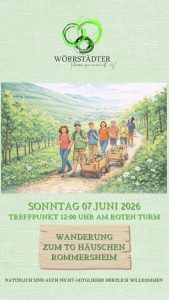 Am Sonntag, den 07. Juni 2026, laden wir euch herzlich zu unserer nächsten WIG‑Wanderung ein. Wir treffen uns um 12:00 Uhr am Roten Turm und machen uns von dort aus gemeinsam auf den Weg zum TG Häuschen in Rommersheim.